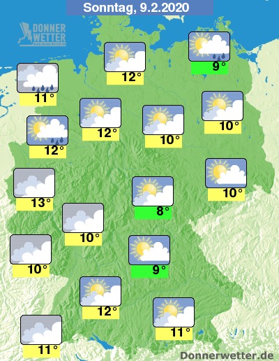 Am Sonntag ist es im Osten und Süden noch oft heiter, jedoch ziehen im Tagesverlauf auch hier zunehmend mehr Wolken auf. Im übrigen Land ist es schon überwiegend stark bewölkt und ab dem Nachmittag setzt zuerst im Norden, gegen Abend auch im Westen Regen ein, sonst bleibt es aber trocken. Über der Nordwesthälfte weht ein starker und zunehmend stürmischer Wind. An der Nordsee herrscht teils schwerer Sturm. Die Temperatur erreicht milde 8 bis 13 Grad.