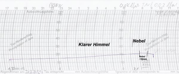 Unser Schrieb zeigt den Verlauf des Tauniederschlags seit Montagabend an unserer Wetterstation in Bonn. Gut zu erkennen: Der Nebelmorgen!