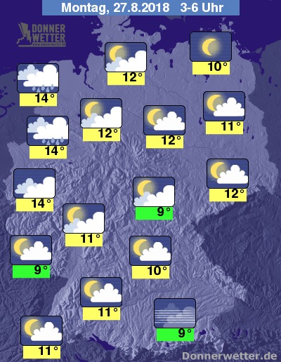 In der Nacht zum Montag ist der Himmel anfangs noch verbreitet locker bewölkt oder sternenklar und dazu trocken. Vom Emsland bis zum Niederrhein verdichten sich die Wolken etwa ab Mitternacht und im Laufe der zweiten Nachthälfte setzt hier zeitweise Regen ein. Die Temperatur sinkt auf 14 Grad an der Ems und bis 9 Grad in Rosenheim.