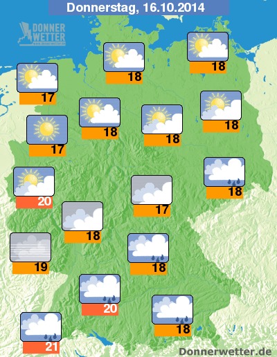 Am Donnerstag ist es im Norden und teils im Westen meist locker bewölkt und trocken, weiter nach Süden und Osten ziehen meist dichte Wolken durch und es fällt zeitweise auch Regen. Die Temperatur steigt auf 17 bis 21 Grad.