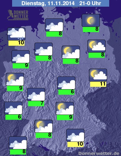 Heute Abend zeigt sich der Himmel häufig aufgelockert bewölkt, in der Südwesthälfte des Landes jedoch auch vielerorts stark bewölkt. In Mecklenburg-Vorpommern herrscht zeitweise ein sternenklarer Himmel. Regen ist im Umfeld zur niederländischen Grenze möglich, sonst bleibt es trocken. Die Abendtemperatur liegt bei 11 Grad in Dresden und 6 Grad im Saargau.