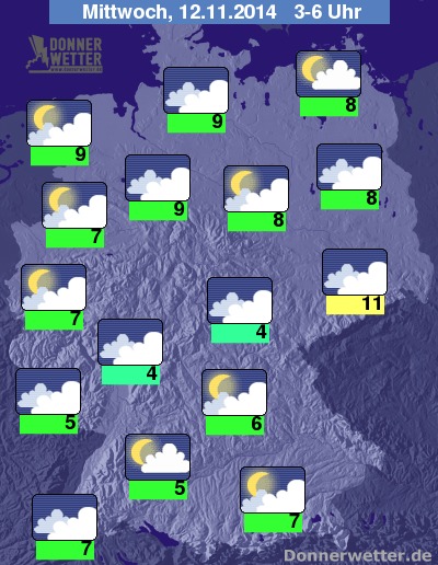 In der Nacht zum Mittwoch ist der Himmel verbreitet aufgelockert bis stark bewölkt. In Mecklenburg-Vorpommern ist es auch häufig noch locker bewölkt. Dazu fällt in der Norddeutschen Tiefebene hier und da etwas Regen oder Sprühregen, sonst bleibt es weitgehend trocken. Bis zum Morgen bildet sich stellenweise Nebel oder Hochnebel. Die Temperatur sinkt auf teils sehr milde 11 Grad in der Lausitz und bis 4 Grad am Odenwald.
