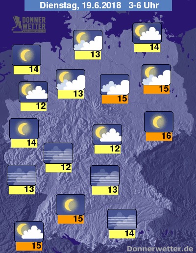 In der kommenden Nacht ist es über dem Norden zumeist locker, teils wechselnd bewölkt. Im übrigen Land ist es sogar verbreitet sternenklar und es ziehen nur hier und da mehr Wolken durch, dazu bleibt es landesweit trocken. Die Temperatur sinkt auf 16 Grad in Dresden und bis 12 Grad im Saargau.