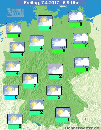Auch in den Morgenstunden halten die Schauer im Nordosten Deutschlands an. Ansonsten starten wir mit einem zumeist trockenen Mix aus Sonne und Wolken in den Tag. Die Temperaturen liegen bei Werten um 0 Grad C im Saarland und 8 Grad C an der Ostseeküste.