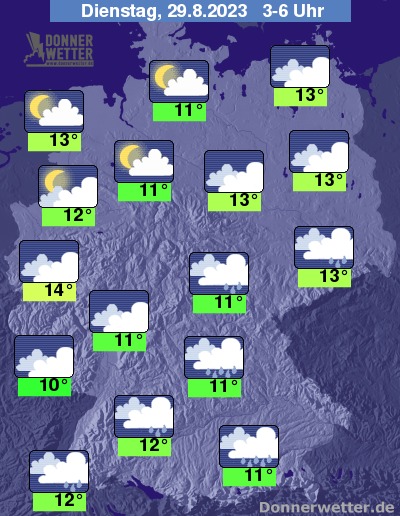 In der Nacht zum Dienstag bleibt es vom Süden bis nach Sachsen und Thüringen bedeckt und es fällt zeitweise Regen, wobei sich die Niederschläge bis zum Morgen auch bis nach Sachsen-Anhalt ausbreiten. In den übrigen Landesteilen ist es oft stark, teils locker bis aufgelockert bewölkt und dazu weitgehend trocken. Die Temperatur sinkt auf 14 Grad im Rheinland und bis 10 Grad im Saargau.