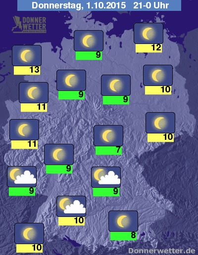 Heute Abend zeigt sich der Himmel über der Bundesrepublik verbreitet sternenklar. Im Süden können jedoch auch gebietsweise einige Wolken durchziehen, dabei bleibt es aber trocken. Die Abendtemperatur liegt bei 13 Grad an der Nordsee und um 7 Grad am Thüringer Wald.