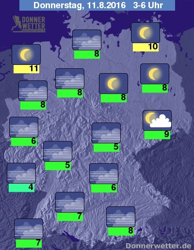 In der kommenden Nacht halten sich am Alpenrand, am Erzgebirge und direkt an den Küsten hier und da dichtere Wolken, die vereinzelte Schauer bringen können. Im großen Rest des Landes präsentiert sich der Himmel jedoch sternenklar und es bleibt dazu trocken. Die Temperatur sinkt auf 11 Grad in Cuxhaven und bis 4 Grad im Saargau.