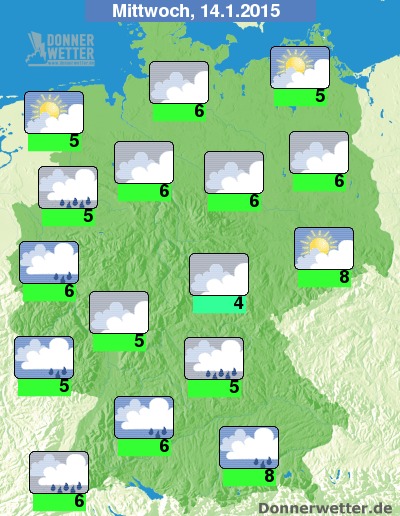 Heute halten sich größtenteils dichte Wolken und es kann nur hier oder da auch mal etwa auflockern, die größten Chancen auf zeitweiligen Sonnenschein haben die Küstenregionen und Teile Ostdeutschlands, hier bleibt es auch überwiegend trocken, sonst muss hingegen häufig mit Regen oder Schneeregen gerechnet werden. Die Temperatur steigt auf 4 Grad am Elstergebirge und etwa 8 Grad in München. Der Wind weht oft frisch bis stark mit teils stürmischen Böen. Auf den Bergen und an der See ist es teils stürmisch mit möglichen Sturmböen, anfangs auch noch mit vereinzelten schweren Sturmböen.