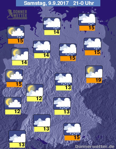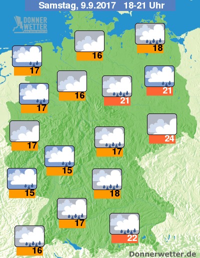 Am späten Abend lockert die Wolkendecke dann von Nordwesten her zunehmend auf, phasenweise kräftigen Regen gibt es weiterhin vor allem östlich der Weser sowie auf einem Streifen zwischen Thüringen und dem Berchtesgadener Land.