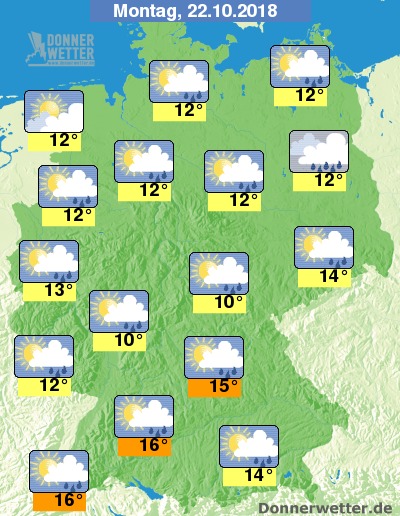 Heute ist es den Tag über zumeist wechselnd bis stark bewölkt, von Nordwesten zieht allerdings eine Kaltfront mit vorübergehend sehr kompakten Wolken und dazu leichtem Regen übers Land hinweg, vor und hinter der Front ist es dagegen meist trocken. Die Temperatur steigt nur noch auf 10 Grad im Thüringer Becken und bis 16 Grad in Stuttgart.