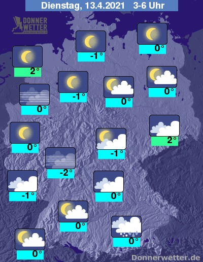 In der Nacht zum Dienstag zeigt sich der Himmel über der Nordwesthälfte Deutschlands meist sternenklar. Weiter nach Südosten hin ist der Himmel hingegen meist dicht bewölkt und im Südosten fällt auch Schnee, Schneeregen oder Regen, sonst bleibt es trocken. Die Temperatur sinkt auf 2 Grad an der Nordsee und bis -2 Grad am Taunus.