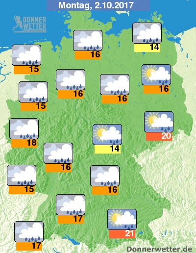 Mit auffrischendem Südwestwind ziehen kompakte Wolken von West nach Ost über Deutschland hinweg und bringen Regen und Schauer. Die Sonne hat nur im Osten sowie in Bayern noch die Chance in Erscheinung zu treten, bevor im Laufe des Tages auch dort die Regenwolken ankommen. Mit Temperaturen von 17 bis 21 Grad wird es hier auch am wärmsten. Sonst erreichen die Werte nur 13 bis 17 Grad. In der Nacht auf Dienstag zieht eine weitere Regenzone über die Mitte und den Süden hinweg. Dabei kann es zum Teil kräftig schütten.