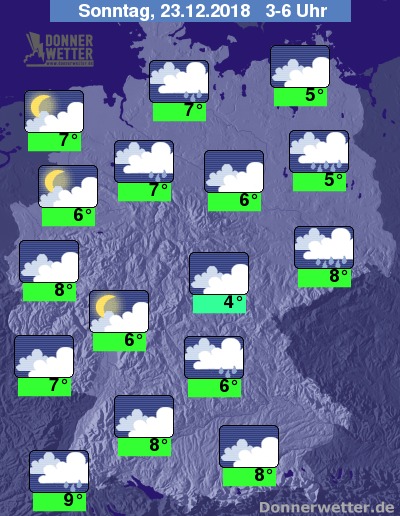 In der Nacht zum Sonntag fällt zunächst im Osten und Nordosten gebietsweise Regen, während es sonst unter starker Bewölkung meist trocken bleibt. Gegen Morgen zieht im Süden und Südwesten neuer Regen auf, sonst ist es überwiegend trocken. Die Temperatur sinkt auf 9 bis 4 Grad.