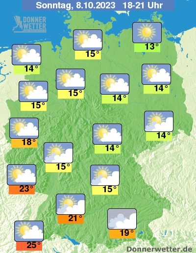 Heute Abend ist es über der Nordhälfte überwiegend heiter, teils auch wechselnd wolkig. Weiter nach Süden ziehen meist mehr Wolken durch, aber auch hier ist es noch zmeist aufgelockert bewölkt. Es bleibt überall trocken bei 13 Grad in Neubrandenburg und 25 Grad in Freiburg.
