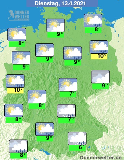 Heute ist es im Süden überwiegend stark bewölkt, dabei bilden sich zeitweise Schnee- oder Regenschauer. Im übrigen Bundesgebiet ist es teils heiter, zum Teil ist es stark bewölkt, dazu bilden sich einzelne Schnee- oder Regenschauer. Die Temperatur erreicht etwa 6 Grad in München und bis 10 Grad in Köln.