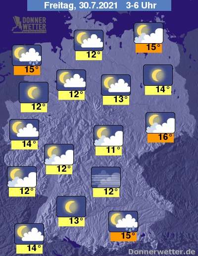 In der Nacht zum Freitag bilden sich über Oberbayern bis weit nach Mitternacht weitere, teils gewittrige Schauer. Einzelne Schauer sind auch im Nordseeumfeld möglich. Im übrigen Bundesgebiet ist der Himmel dagegen zumeist locker bewölkt oder sternenklar. Zum Teil ist es auch aufgelockert bewölkt, dazu bleibt es trocken. Die Temperatur sinkt auf 16 Grad in der Lausitz und bis 11 Grad im Eichsfeld.