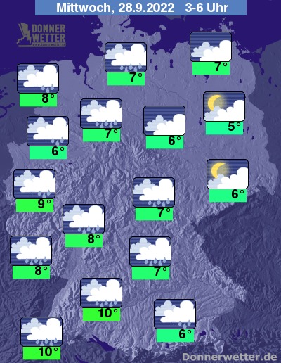 In der folgenden Nacht bringen dichte Wolken wiederholt Schauer, dazwischen kann es auch hier und da mal etwas auflockern. Die Temperatur sinkt auf 10 Grad in Stuttgart und etwa 5 Grad in Potsdam.