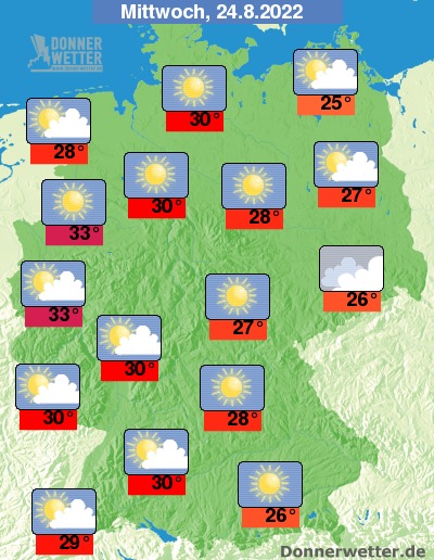 Heute zeigt sich das Wetter heiter bis sonnig, im äußeren Osten ziehen zum Teil dichte Wolken durch und es bilden sich vereinzelt auch Schauer. Im übrigen Land bleibt es trocken bei 25 Grad auf Rügen und bis 33 Grad in der Kölner Bucht.