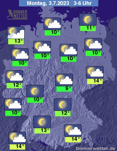 In der Nacht zum Montag zeigt sich der Himmel locker bewölkt oder sternenklar, dazu bleibt es trocken. Die Temperatur sinkt auf 14 Grad in München und etwa 9 Grad in Erfurt.