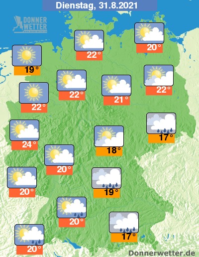 Am Dienstag bleibt es im Süden und Osten des Landes oft stark, zum Teil auch aufgelockert bewölkt, dabei bilden sich zeitweise Schauer. Weiter nach Nordwesten hin zeigt sich zunehmend die Sonne und im Nordwesten ist es verbreitet sonnig, dabei bleibt es trocken. Die Temperatur steigt auf 17 Grad in der Lausitz und bis 24 Grad im Rheinland.