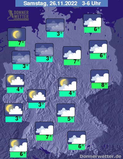In der kommenden Nacht klingen auch die Niederschläge in den östlichen und südöstlichen Landesteilen nach und nach ab, jedoch bleibt es über der Südosthälfte des Landes weitgehend bedeckt. Nach Nordwesten hin zeigt sich der Himmel dagegen zunehmend sternenklar, hier bleibt es weitgehend trocken. Stellenweise bildet sich Nebel. Die Temperatur sinkt auf 8 Grad in Dresden und etwa 3 Grad in Hannover.