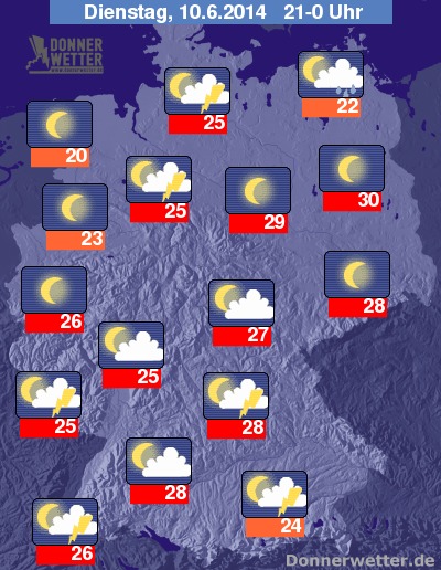 Am Abend können sich gebietsweise schwere Gewitter mit möglichen Sturmböen und großem Hagel bilden. Die Abendtemperatur liegt bei sehr warmen 30 bis 20 Grad.