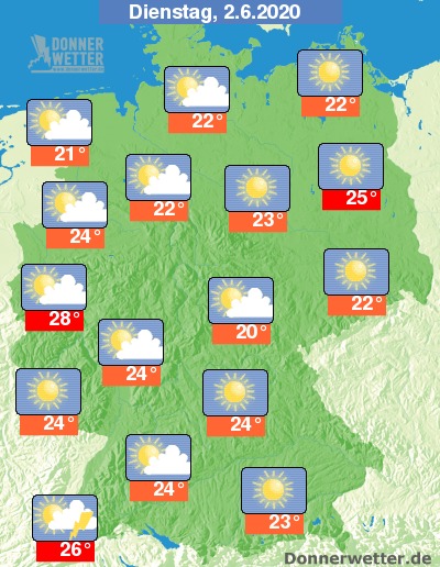 Heute bleibt es mehrheitlich heiter bis sonnig, gebietsweise ziehen allerdings auch einige Wolken durch, es bleibt aber weitgehend trocken. Die Temperatur erreicht 20 Grad im Eichsfeld und bis zu 28 Grad in Bonn.
