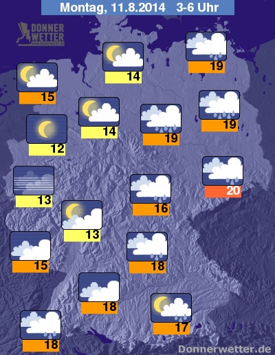 In der Nacht zum Montag ziehen die dichten Wolken mit teils starkem Regen auch in den Südosten und Osten des Landes. Von Westen her reißt der Himmel dagegen schon wieder auf und die Sterne können sich mehr und mehr zeigen. Die Tiefstwerte erreichen tropische 20 Grad in Dresden und deutlich kühlere 12 Grad am Niederrhein.