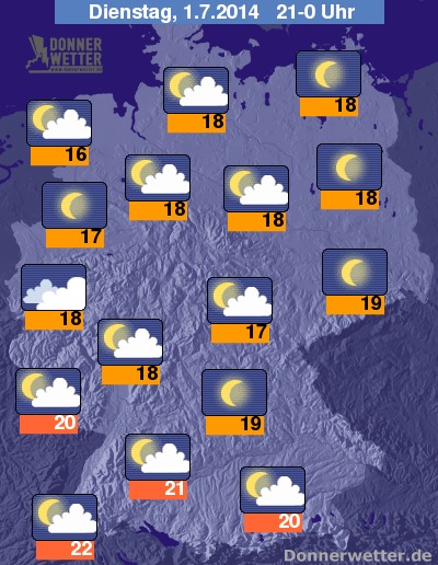 Am Abend ist es weiterhin vielfach klar oder nur locker bewölkt, ganz im Süden können die Wolken auch dichter sein, dabei bleibt es aber auch hier weitgehend trocken. Die Temperatur liegt bei teils noch 22 Grad in Freiburg und etwa 16 Grad im Norddeutschen Tiefland.