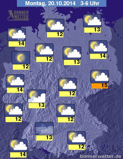 In der nachfolgenden Nacht klingt der Regen in der Nordhälfte nach und nach ab, sonst bleibt es verbreitet locker bis aufgelockert bewölkt und weitgehend trocken. An der Nordsee sind jedoch einzelne Schauer möglich. Es bildet sich stellenweise Nebel oder Dunst. Die Temperatur sinkt auf 15 Grad in Dresden und bis 12 Grad am Harz.