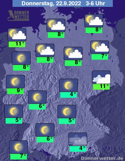 In der Nacht zum Donnerstag klart der Himmel über der Republik verbreitet auf. Lockere Wolkenfelder ziehen über den Norden und Osten des Landes hinweg. Über Sachsen hält sich zum Teil auch dichte Bewölkung, jedoch bleibt es trocken. Die Temperatur sinkt auf 11 Grad in Emden und bis 4 Grad in Augsburg.