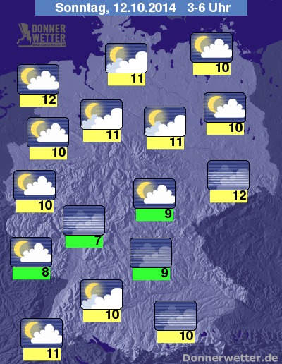 In der kommenden Nacht ist der Himmel meist aufgelockert oder nur locker bewölkt, dazu bleibt es weitgehend trocken, jedoch bilden sich zum Teil dichter Nebel oder Hochnebel, teils wird es dunstig-trüb. Die Temperatur sinkt bis zum Morgen auf 12 Grad an der Nordseeküste und 7 Grad im Rheingau.