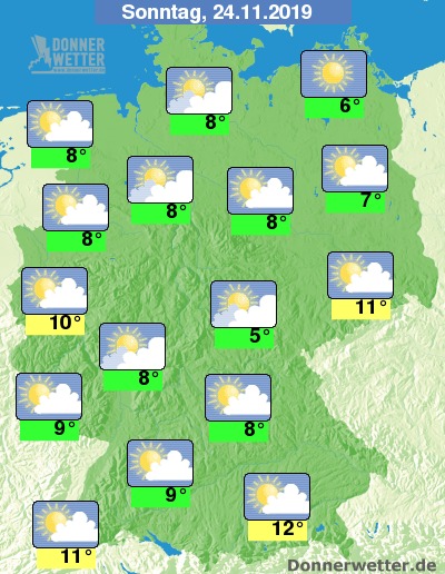 Am Sonntag ist es teils stark bewölkt oder trüb, gebietsweise ist es aber auch heiter bis sonnig, dabei bleibt es im gesamten Bundesgebiet trocken. Die Temperatur erreicht 5 Grad im Grabfeld und bis 12 Grad in München.