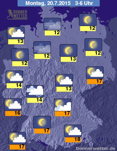In der bevorstehenden Nacht zeigt sich der Himmel über der Nordhälfte Deutschlands überwiegend sternenklar, hier und da können ein paar Wolken durchziehen, dazu bleibt es trocken. Weiter nach Süden ist es meist locker oder aufgelockert bewölkt und trocken, vor allem entlang des Mains halten sich aber auch teils dichte Wolken, die etwas Regen bringen können. Die Temperatur sinkt auf 17 Grad im Kraichgau und bis 12 Grad in Vorpommern.
