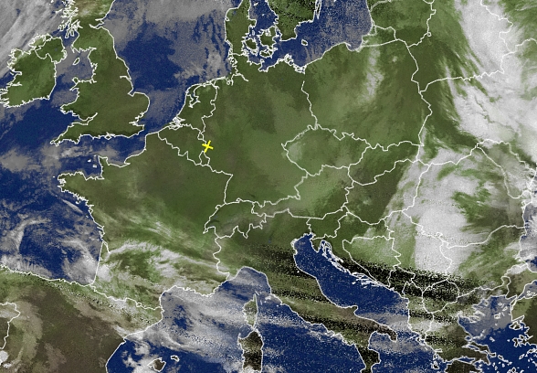Das Satellitenbild zeigt lockere Wolkenfelder über Deutschland. Über der Nordsee sind einige Schauerwolken zu erkennen. Regenwolken liegen sonst über Rumänien und Bulgarien und dem Mittelmeerraum.