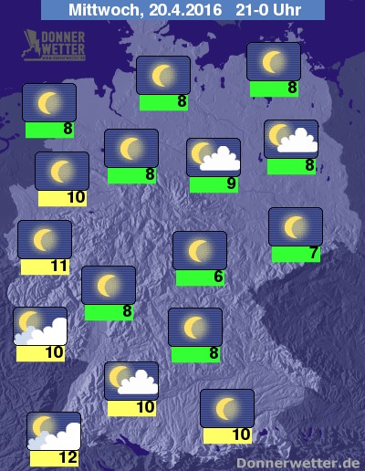 Heute Abend bleibt der Himmel über der Bundesrepublik verbreitet sternenklar. Im Südwesten ziehen allerdings zunehmend dichtere Wolken auf, die jedoch keinen Regen bringen. Die Abendtemperatur liegt bei 12 Grad in Freiburg und 6 Grad im Vogtland.