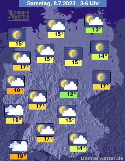 In der Nacht zum Samstag werden die Wolken im Südwesten Deutschlands dichter und es können sich hier auch lokale Schauer bilden. Im Norden und Osten ist der Himmel meist sternenklar, im übrigen Land gering bis locker bewölkt, dazu bleibt es trocken. Die Temperatur sinkt auf 19 Grad in Freiburg und bis 12 Grad in Jena.