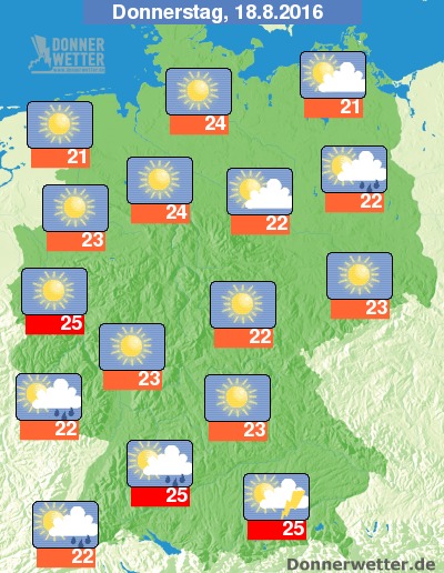 Heute scheint über der Bundesrepublik verbreitet die Sonne von einem oft wolkenlosen und sonst nur locker bewölktem Himmel. Im Osten sind die Wolken auch teils mal zahreicher und dichter und einzelne Schauer sind möglich. Im äußeren Südwesten und dem Alpenvorland ziehen oft auch dichte Wolken auf und es bilden sich hier zeitweise Schauer und Gewitter, in den anderen Landesteilen bleibt es trocken. Die Temperatur steigt auf 21 Grad an der Wesermündung und bis 25 Grad in Stuttgart.