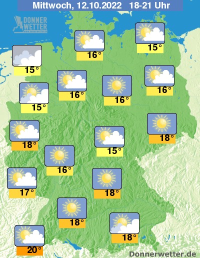 Heute Abend ist es verbreitet heiter oder sonnig. An der Nordsee und im südlichen Bayern ist es auch oft stark bewölkt. In den westlichen Landesteilen nimmt die Bewölkung im Verlauf insgesamt etwas zu. Es bleibt landesweit trocken bei 15 Grad an der See und bis zu 20 Grad im Breisgau.