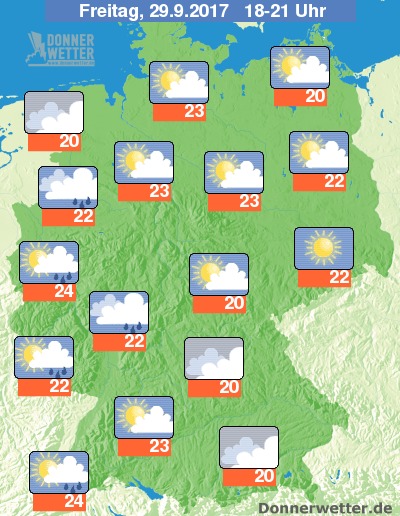 Heute Abend ziehen in den westlichen Landesteilen zunehmend dichte Wolken auf, hierbei können sich sowohl Schauer als auch vereinzelte Gewitter entwickeln. Weiter nach Westen hin zeigt sich das Wetter noch verbreitet heiter bis aufgelockert, nur über Bayern überwiegend stark bewölkt, jedoch trocken. Die Temperatur liegt bei 20 bis 24 Grad.