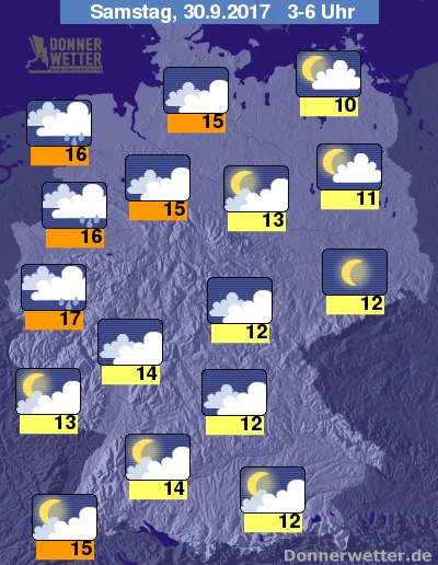 In der Nacht zum Samstag breiten sich von Westen her dichte Wolken bis über die Landesmitte aus. In den östlichen Landesteilen bleibt es bei meist lockerem, teils klarem Himmel trocken, sonst fällt vor allem von NRW bis nach Niedersachsen zeitweise Regen. Die Temperatur sinkt auf 17 Grad in Köln und bis 10 Grad in Stralsund.