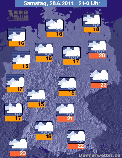 In der Nacht zum Sonntag fällt aus vielen dichten Wolken, teils ergiebiger Regen, im Norden bleibt es überwiegend trocken. Gebietsweise muss mit Regenmengen von über 15 Litern innerhalb von 3 Stunden gerechnet werden. Die tiefsten Temperaturen liegen bei 17 Grad im Breisgau und 10 Grad am Niederrhein.