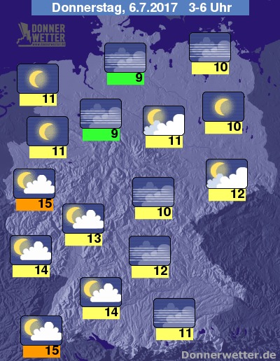In der Nacht zum Donnerstag ist der Himmel über der Bundesrepublik verbreitet nur locker bewölkt und oft auch sternenklar, dazu bleibt es trocken. Die Temperatur sinkt auf 15 Grad in Düsseldorf und bis auf 9 Grad in der Norddeutschen Tiefebene.