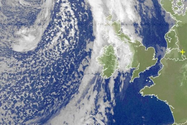 Das aktuelle Satellitenbild zeigt uns die derzeit wolkenlosen Regionen über Europa. Über Irland ist schon die Bewölkung einer Kaltfront zu sehen, die uns am Sonntag erreicht.