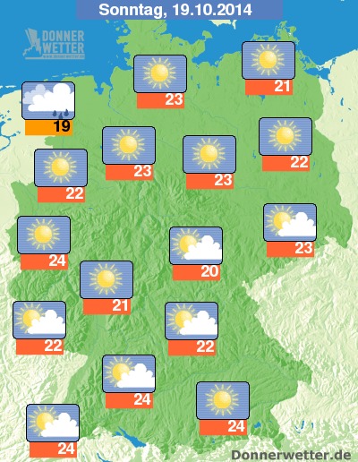 Der Sonntag macht seinem Namen offenbar alle Ehre, denn nach meist rascher Auflösung örtlicher Nebelfelder scheint verbreitet die Sonne und es ziehen meist nur lockere Wolken durch. Vielerorts wird es sogar wolkenlos. Von Nordwesten ziehen am Nachmittag jedoch dichte Wolken und Regen auf, sonst bleibt es aber trocken. Die Temperatur steigt auf 19 Grad im nördlichen Ostfriesland und bis örtlich 24 Grad im Westen und Süden des Landes.
