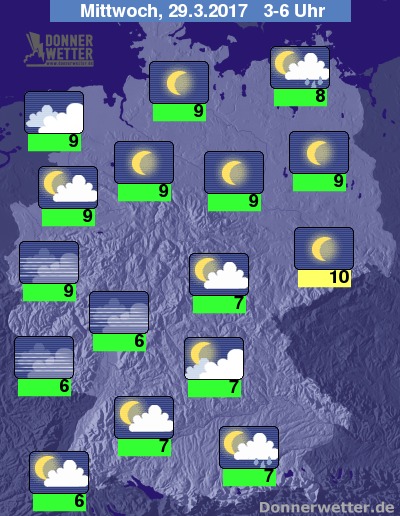 In der Nacht zum Mittwoch zieht im Nord- und Ostseeumfeld oft starke Bewölkung auf, dabei fällt hier auch gebietsweise Regen. Auch am Alpenrand sind bei teils dichteren Wolken einzelne Schauer nicht auszuschließen. Im übrigen Land zeigt sich der Himmel verbreitet locker bewölkt, oft auch sternenklar und es bleibt trocken. Die Temperatur sinkt auf 10 bis 6 Grad.
