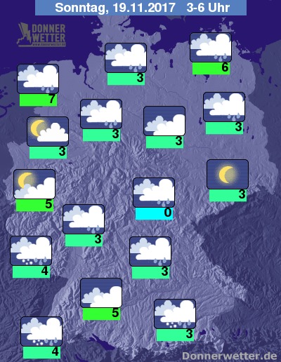 In der Nacht zum Sonntag zieht ein Tiefausläufer mit dichten Wolken und Regen, Schneeregen, Graupel und Schnee in den Süden Deutschlands, während ein neuer Ausläufer von Norden das Land erreicht. Es bilden sich gebietsweise, teils kräftige Schauer. Die Temperatur sinkt auf 7 Grad in Emden und bis 0 Grad im Grabfeld. An der Nordsee herrscht teils Sturm, an der Ostsee weht ein starker und teils stürmischer Wind.