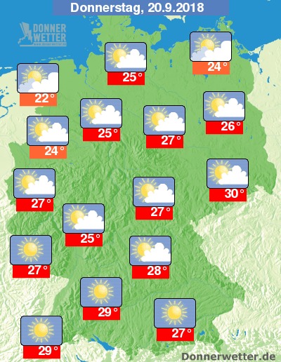 Heute ziehen vor allem über die Nordhälfte teils dichtere Schleierwolken hinweg, sonst verwöhnt uns aber wieder verbreitet die Sonne und heizt die Luft bis zum Nachmittag auf 25 bis 30 Grad. Stellenweise kann es noch etwas wärmer werden. Im Nordwesten, sowie im Küstenbereich von Nord- und Ostsee bleibt es hingegen etwas kühler.
