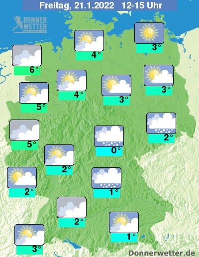 Heute Nachmittag scheint im Norden zwischen oft nur lockeren Wolken häufig die Sonne, sonst ist es aber überwiegend stark bewölkt und zum Teil neblig-trüb. Im Osten und Südosten fällt gebietsweise auch Schnee, während es sonst überwiegend trocken bleibt. Die Temperatur liegt bei 0 Grad im Grabfeld und bis 6 Grad an der Nordsee.