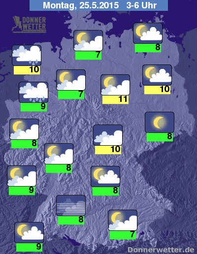 In der folgenden Nacht fällt im äußeren Nordwesten Deutschlands bereits zeitweise Regen, sonst ist es dagegen oft locker oder aufgelockert bewölkt und weitgehend trocken. Vor allem im Osten und Süden zeigt sich auch ein teils sternenklarer Himmel. Im weiteren Nachtverlauf breitet sich der Regen von Nordwesten her noch ein Stück weiter nach Südosten hin aus, so dass bis Sonnenaufgang in der Nordwesthälfte des Landes zeitweiliger Regen möglich ist, sonst bleibt es meist trocken. Die Temperatur sinkt auf 11 Grad in Magdeburg und bis 7 Grad in Oberbayern.